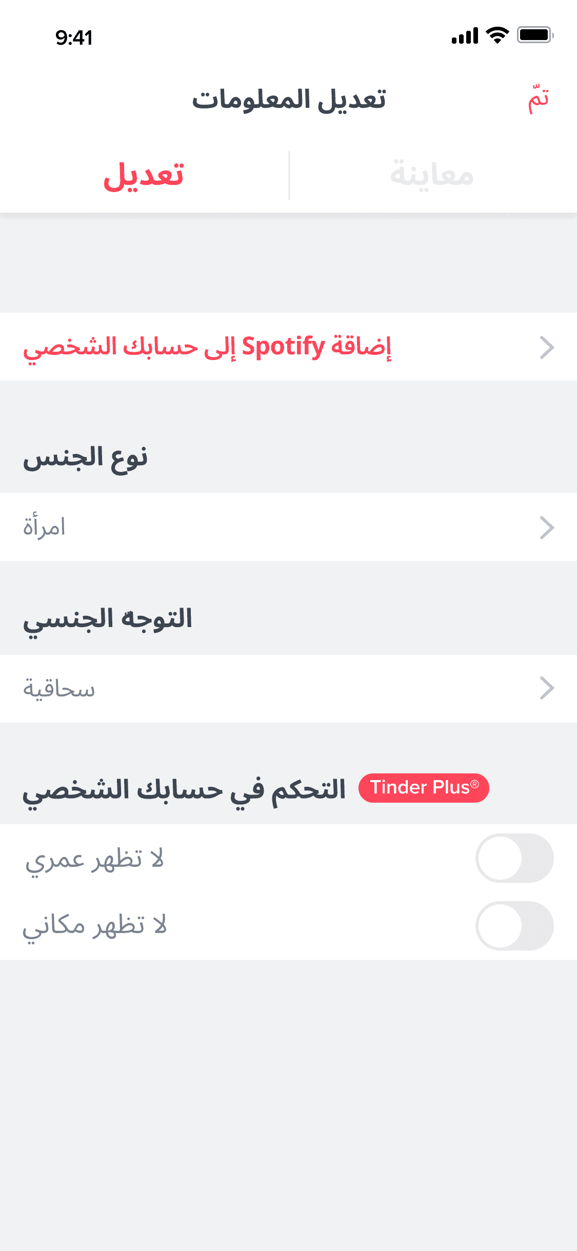 فعّل زر الأشخاص الذين أُعجبت بهم فقط لتَظهَر للأشخاص الذين أبديت إعجابك بهم فقط. إذا كنت مشتركًا في ™Tinder Gold وقُمت بتفعيل هذه الخاصية، فلن ترى أي مُعجبين مُحتملين عبر خاصية معجبٌ بك.